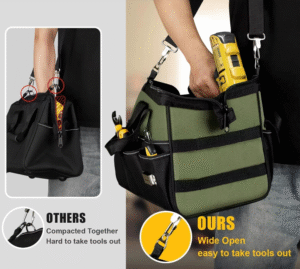 1. Anti-slip design: This tool bag features a sturdy and durable anti-slip bottom design, ensuring stability even on uneven ground and preventing it from easily toppling over. This means you can place heavy or big tools, don’t worrying about the bag will tip over at all.